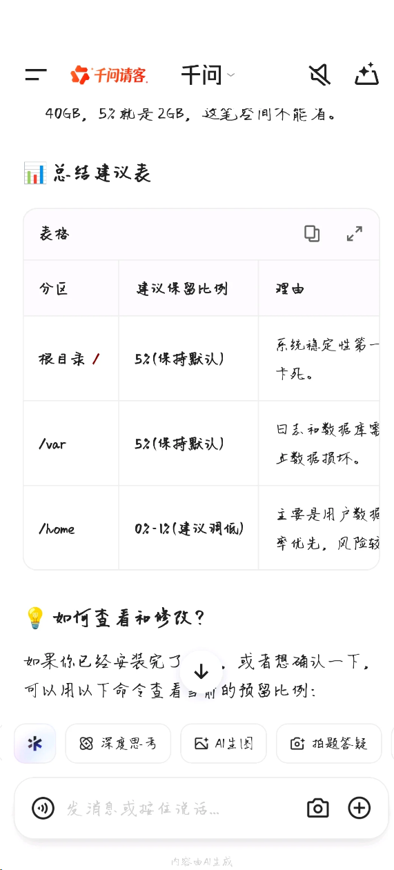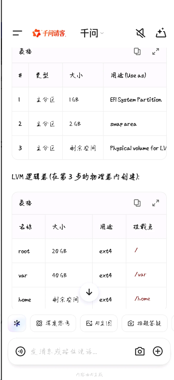 在分配硬盘空间的时候,一开始发现一直找不到我的硬盘在BIOS中修改SATA接口为AHCI即可。通过AI以及个人的情况。分配了一下硬盘空间的大小划分。